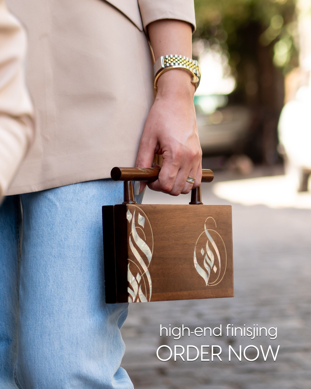Arabic calligraphy handbag made of wood and pearl